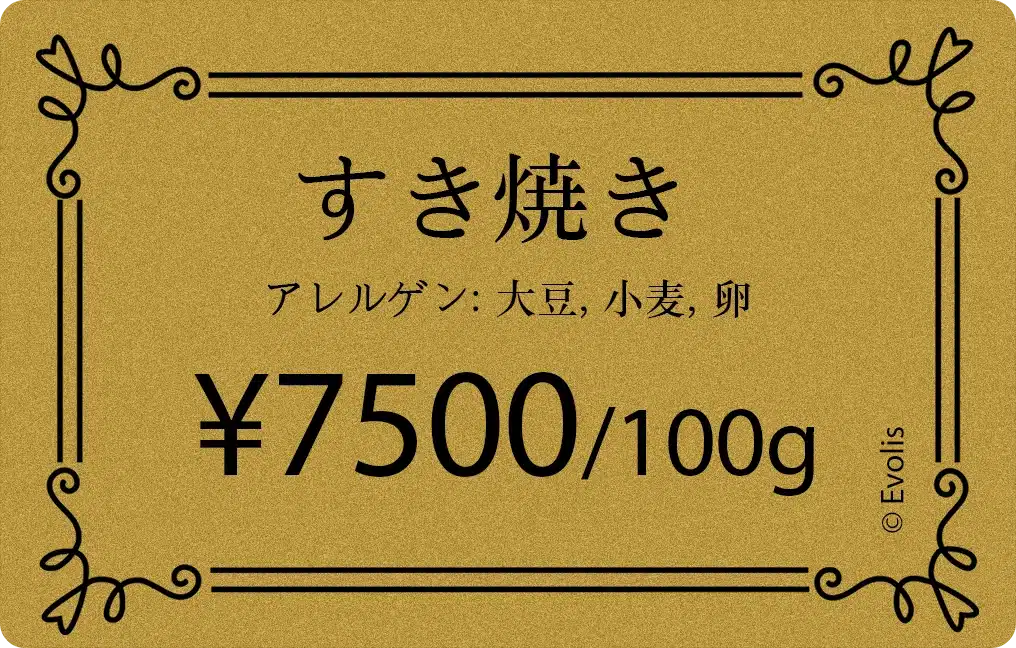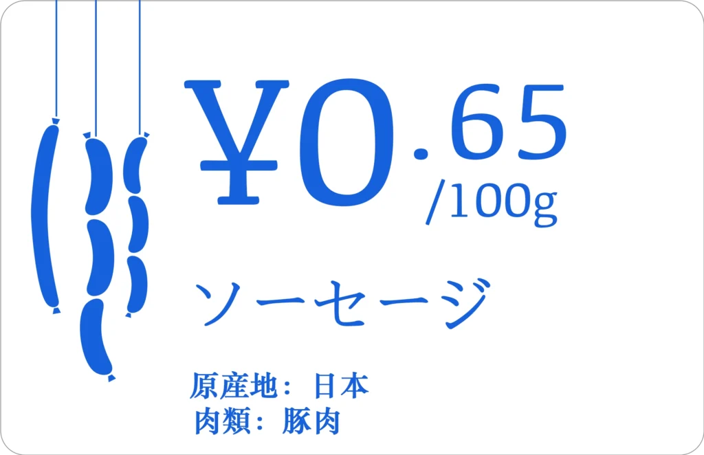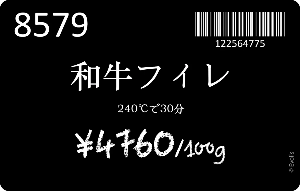 Edikio Price Tagなら、シンプルで見やすく、プロフェッショナルな精肉店価格表示が可能です。多くの種類の肉製品を扱う精肉店では、個別カットやパック売り、バラ売りなど様々な商品が並びます。すべての商品の価格や産地、アレルゲン情報を正確に伝えることが重要です。